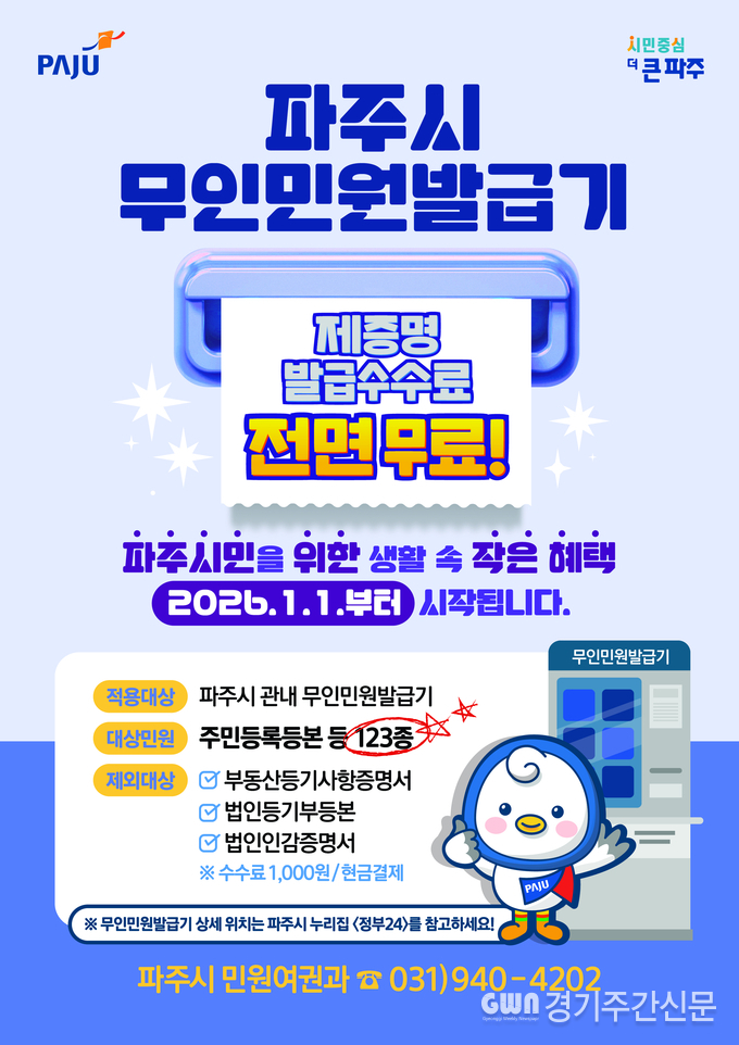 [ 경기주간신문 = 정성경 기자 ] 파주시는 시민들의 비용 부담을 줄이고 생활 편의를 높이기 위해 2026년 1월 1일부터 관내 무인민원발급기에서 발급되는 제증명 수수료를 전면 무료화한다고 밝혔다.
