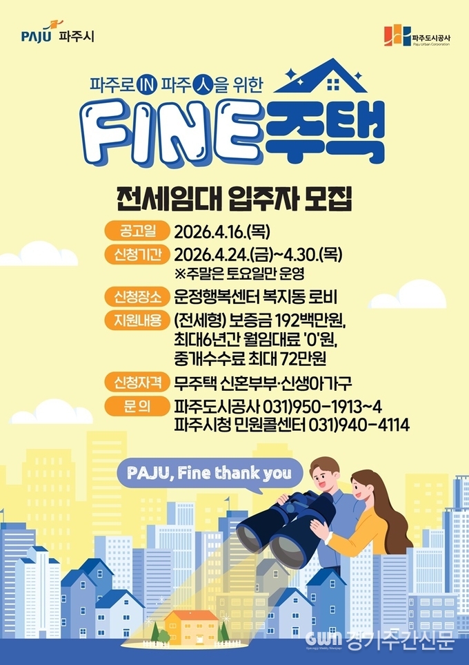 [ 경기주간신문 = 정성경 기자 ] 파주시는 신혼부부와 신생아 가구의 주거비 부담 완화를 위해 ‘파인(FINE)주택’ 전세임대 입주자 신청을 24일부터 받는다.