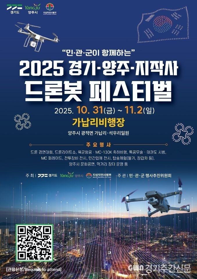 [ 경기주간신문 = 정성경 기자 ] 경기도와 양주시(시장 강수현), 지상작전사령부(사령관 대장 주성운)가 오는 31일부터 11월 2일까지 3일간 가납리비행장 일원에서 「2025 경기ㆍ양주ㆍ지작사 드론봇 페스티벌」을 개최한다.