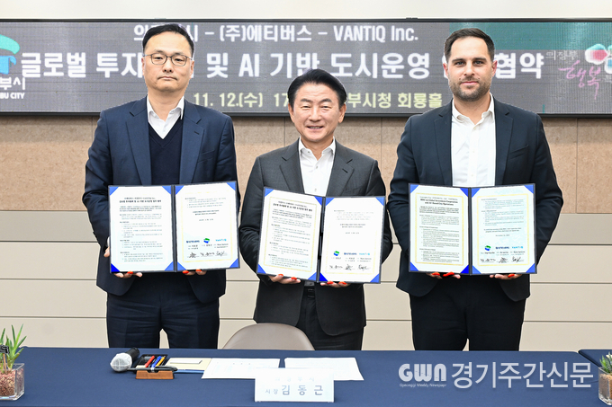 [ 경기주간신문 = 정성경 기자 ] 의정부시는 11월 12일 글로벌 AI 플랫폼 선도기업 밴틱(VANTIQ), 국내 파트너사 ㈜에티버스(Etiverse)와 ‘글로벌 투자협력 및 AI 기반 도시운영’을 위한 업무협약을 체결했다.