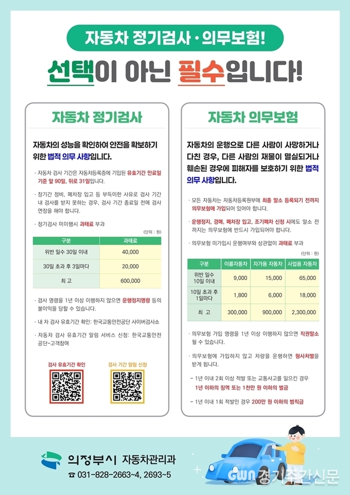 [ 경기주간신문 = 정성경 기자 ] 의정부시(시장 김동근)는 자동차 정기(종합)검사와 의무보험 가입 등에 대한 지속적인 홍보를 전개하고 있다.